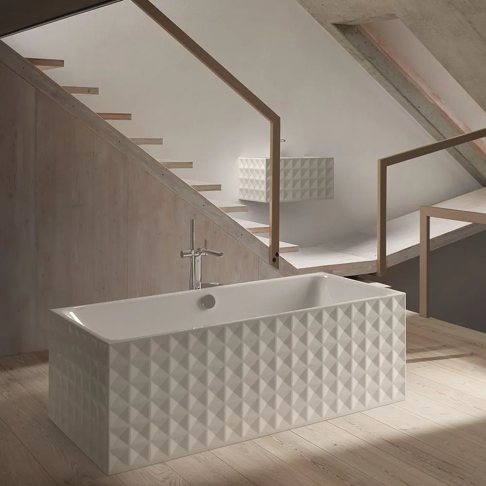 Die freistehende BetteLoft Ornament ist die ideale Wahl für alle, die ein ausdrucksstarkes Highlight im Badezimmer setzen möchten. Während der Innenkörper dem der klassischen BetteLoft entspricht, sorgt die feste Verkleidung mit einem sechsreihigen Ornamentmuster für eine luxuriöse Note. Die facettenreiche Struktur erzeugt ein faszinierendes Spiel aus Licht und Schatten und verleiht dem Raum besonderen Charme.