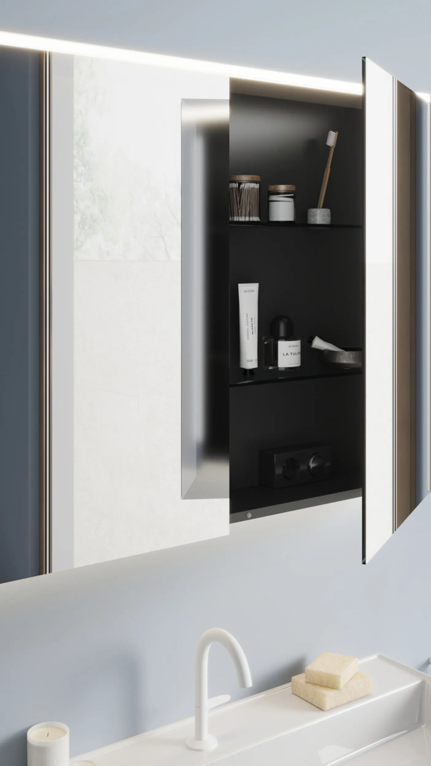 • Spiegelschrank mit durchgehender Beleuchtung am Waschtisch