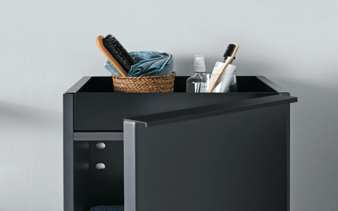Mit Fiumo genießen Sie auch in kleinen Badezimmern Ordnung und Komfort. Hochschränke und Halbhochschränke mit integrierter Ablagebox (Breite 350 mm, Höhe 1160 mm bzw. 960 mm, Tiefe 320 mm) schaffen auf kompaktem Raum überraschend viel Platz. Ergänzt wird das Programm durch ein raumsparendes Wandpaneel (Breite 350 mm, Höhe 600 mm, Tiefe inkl. Halterungen und Ablagen 150 mm), das dank cleverem Hängesystem zusätzlichen Stauraum auf schmaler Fläche bietet.