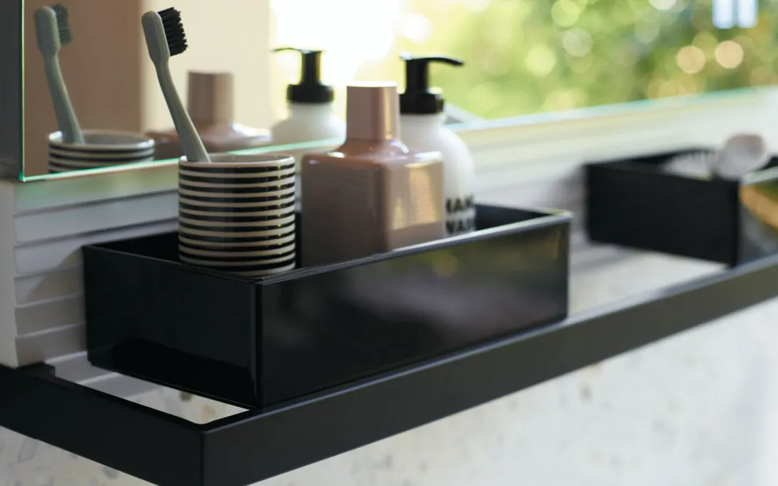 Die faltenähnliche Struktur der Plisseefront ist nicht nur dekorativ, sondern auch praktisch. In die eingefräste Riffelung lässt sich eine Reling aus Metall einklinken, die als Halterung für Handtücher oder Ablage-Behälter dient. So können Spiegel, Auszüge, Wandpaneele und Schränke funktional erweitert werden. Direkt am Spiegel über dem Mineralgusswaschtisch angebracht, haben Sie alle Utensilien griffbereit – und behalten stets den Überblick am Waschplatz.