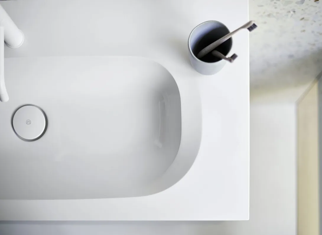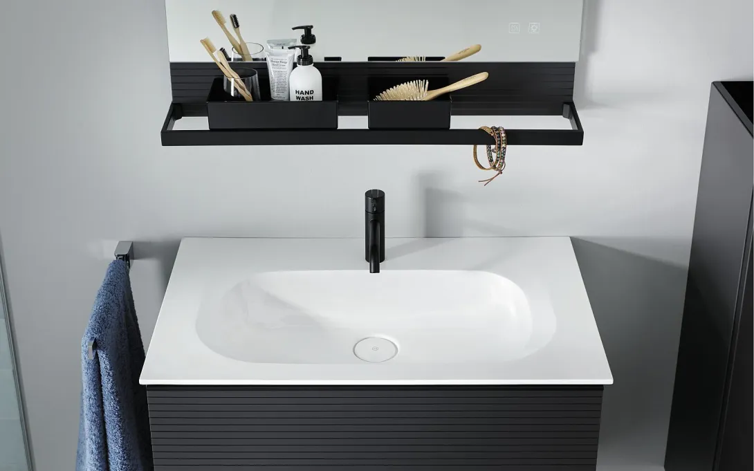Der Name Fiumo leitet sich vom italienischen Wort „Fiume“ (Fluss, Strom) ab – und genau dieses Prinzip spiegelt sich im Design wider. Weich ineinander übergehende Linien und Ebenen prägen die Kollektion und schaffen eine harmonische Optik. Besonders eindrucksvoll zeigt sich das am Mineralgusswaschtisch: Schmale Kanten und fließende Formen verschmelzen zu einem echten Blickfang im Badezimmer.
