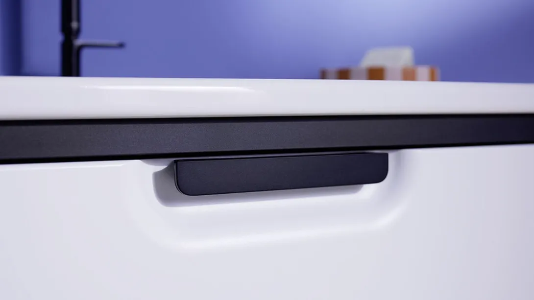 Die Kollektion Vry vereint moderne Ästhetik mit zeitloser Eleganz. Klare Linien treffen auf weich-organische Formen, helle Flächen kontrastieren mit schwarzen, grafisch betonten Rahmen. Das integrative Design sorgt dafür, dass diese Gegensätze harmonisch wirken. Praktische Funktionselemente sind dezent integriert und bleiben optisch im Hintergrund – für ein Badezimmer, das stilvoll und zugleich alltagstauglich ist.