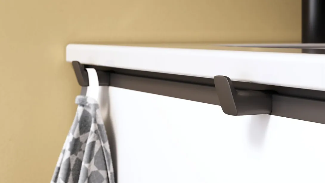 Das zentrale Gestaltungselement von Vry ist der dekorative Metallrahmen aus mattschwarz eloxiertem Aluminium. Er sorgt für eine eindrucksvolle, grafische Wirkung im Badezimmer. Gleichzeitig überzeugen die weich gerundeten Kanten auch funktional: In die seitlichen Querstreben unterhalb der Waschtischkante ist eine Nut integriert, in die sich Accessoires wie Haken, Fönhalter oder Handtuchstangen flexibel einklinken und wieder entfernen lassen.