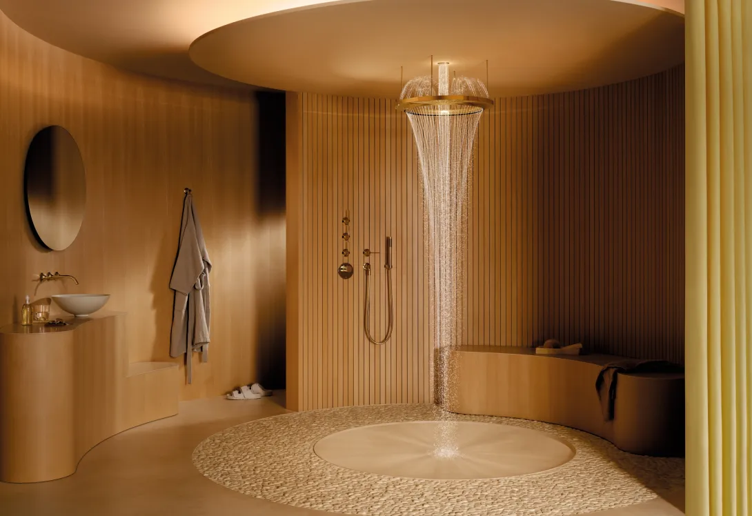 Besonders innovativ ist der von Dornbracht entwickelte Regentropfen: Er ist weich, voluminös und trifft nahezu schwerelos auf den Körper – für ein sanftes und wohltuendes Duscherlebnis wie in der Natur.
