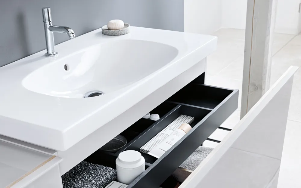 Die Badserie Acanto von Geberit wurde auf Basis von Konsumententests entwickelt und erfüllt dadurch vielfältige Alltagsbedürfnisse. Besonders deutlich wird dies im Innenleben der Möbel: