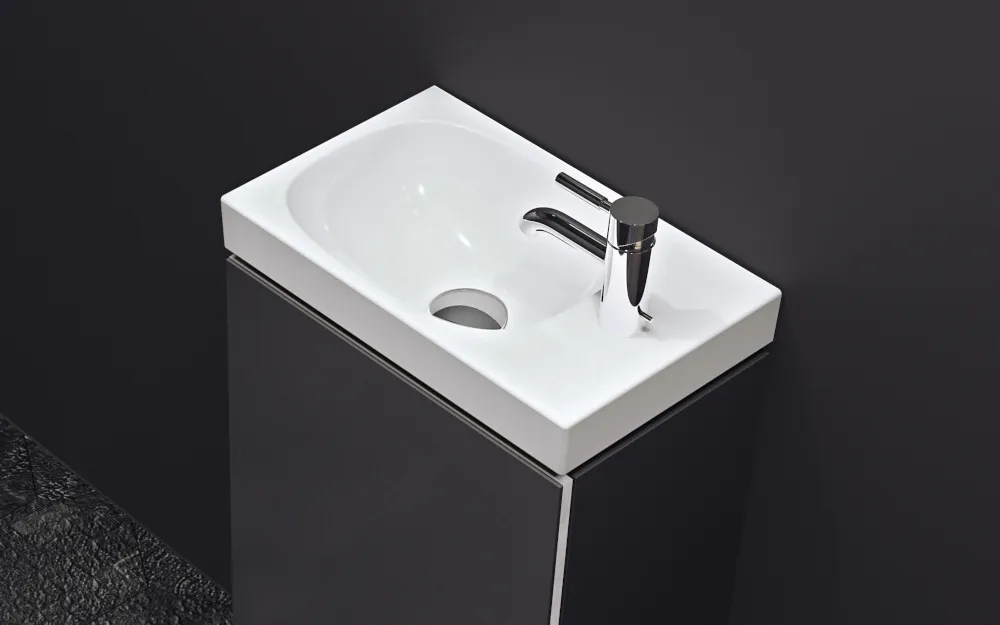 Die Möbelwaschtische der Geberit Acanto Serie überzeugen mit dem eleganten SlimRim Design, bei dem sich der Beckenrand nahezu bündig in die Möbeloberfläche einfügt.