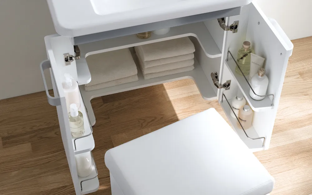 Der fahrbare Hocker ist ein praktisches Hilfsmittel und bietet unter seinem klappbaren Sitz zusätzlichen Stauraum. Der Waschtischunterschrank überzeugt mit zurückgesetzten Regalböden, die im Sitzen Beinfreiheit schaffen und leicht erreichbar sind. Eine Halterung unter dem Waschtisch erleichtert das Heranziehen und bietet sicheren Halt. Ergänzend sorgen montierbare Griffe – auch als Handtuchhalter nutzbar – für noch mehr Komfort. Abgerundet wird der Waschplatz durch einen tiefer gesetzten LED-Lichtspiegel, der sowohl im Sitzen als auch im Stehen optimale Ausleuchtung bietet.