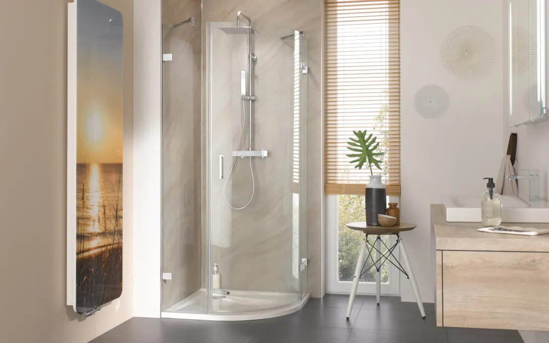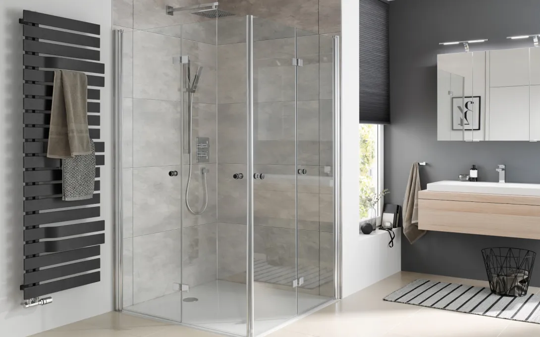 Die Duschkabinen bieten verschiedene Türlösungen wie Drehfalttüren oder Schiebetüren. Dadurch entsteht ein großzügiger Einstieg, der auch in kleinen Badezimmern ideal genutzt werden kann.